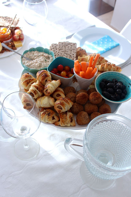 E as entradas é simplificar. Desta vez, em vez de tábua de queijos e enchidos, tinha só um queijinho com doce de abóbora caseiro na mesa. Fiz folhadinhos “comida de massa para massas” como lhe costumo chamar, porque não dão grande trabalho, também podem ser preparados de véspera. E quem diz folhadinhos, diz quiches e empadas familiares. Fiz folhados de alheira e de queijo e mel, mas podem vaiar no que quiserem, como salsicha e mostarda, cogumelos e queijo, alheira e espinafres, farinheira, morcela e maçã..... Outras sugestões rápidas e sem grande trabalho: ovos mexidos com farinheira (ou espargos, ou cogumelos), patês caseiros de atum , delícias, cavala, sardinha..... Tudo em pratos bonitos, composto e com tostas variadas e pão para cada um se ir servindo. Não sou muito de salgadinhos, mas são sempre uma opção que a maioria das pessoas gosta. Podem sempre fazer com antecedência congelar e apenas fritar no dia. Para os ainda mais práticos e descomplicados. Comprar feitos e de boa qualidade e fritar. Simples. No jantar do António preparei folhadinhos de queijo e mel, de alheira, um patê de atum, azeitonas temperadas e bolinhas de carne - tipo croquetes.