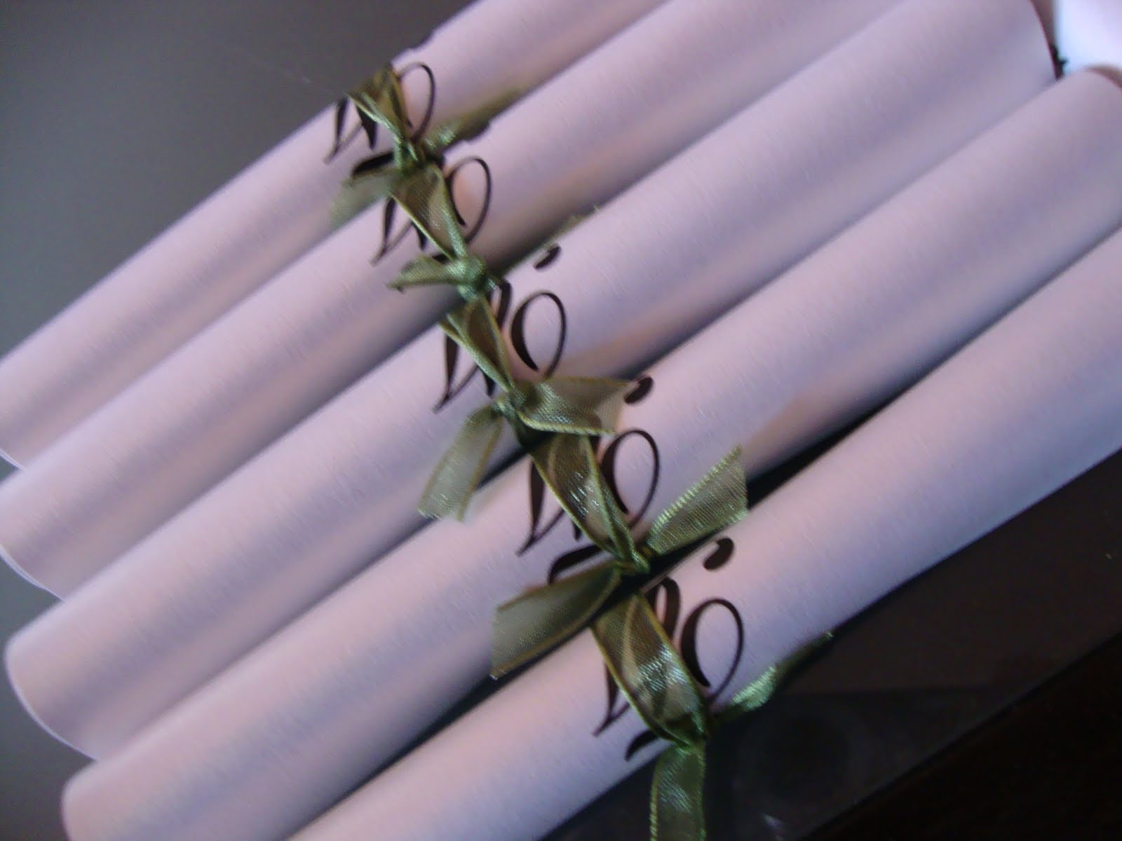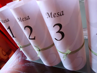 - Como marcadores das mesas, a solução encontrada foi também muito simples. Imprimiu-se em papel grosso a numeração das mesas e fez-se depois um rolo que se atou com uma fitinha de organza verde (a 0,25€ cada metro de fita).