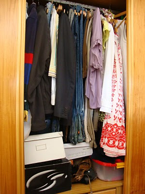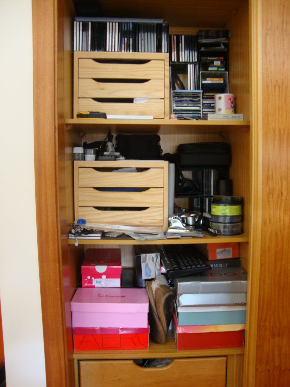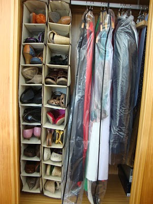 8 pares de sapatos para dar, mais um saco cheio de roupa. Muitas caixas para a reciclagem. Novos organizadores de sapatos (4,5€/cada) que ocupam menos espaço que as caixas e que permitem logo ter uma ideia de todos os sapatos (sapatos, pois as botas e as sapatilhas, continuam arrumados noutro lado!). Roupa de cerimónia ou com menos uso devidamente arrumada dentro de uns saquinhos próprios (0,75€/cada).