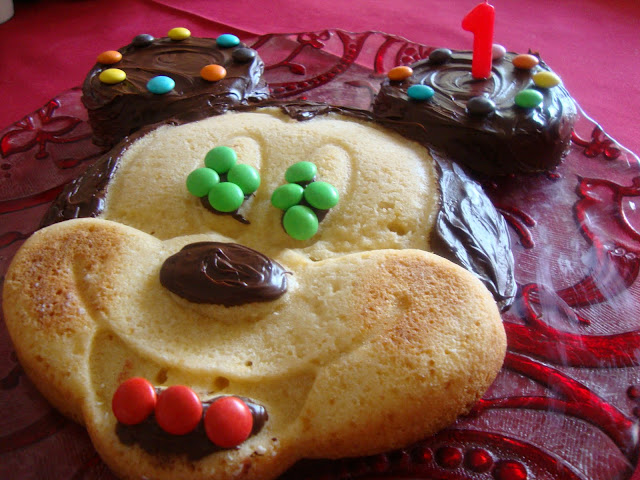 Como não podia deixar de ser o bolo ficou a meu cargo. E com pouco fiz um bolo giro e ideal para crianças. Usei uma receita de bolo de iogurte, um pouco de chocolate derretido para a cobertura, e pintarolas para decorar. Claro que a minha forma do Rato Mickey tornou um bolo banal num bolo ideal para comemorar um aniversário infantil. E muito mais saboroso e saudável (já para não dizer económico) do que qualquer bolo de compra, E claro, feito com muito amor e carinho por esta madrinha babada!