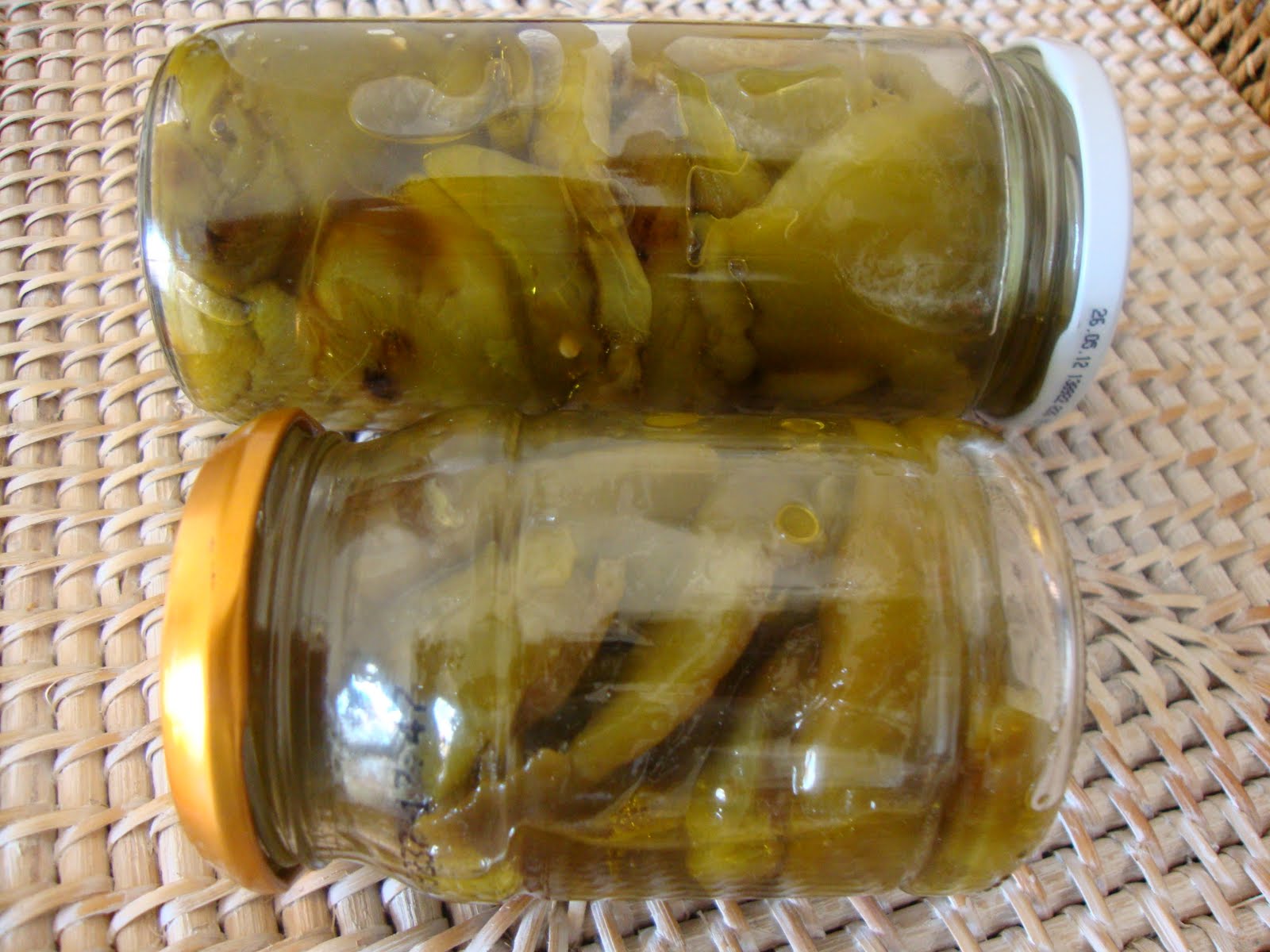 Assei os pimentos no grelhador electrico, tirei-lhes a pele e limpei-os de sementes. Coloquei depois em frascos previamente esterilizados e que fechassem bem (que da outra vez correu mal por causa do frasco que eu usei que não era totalmente hermético!). Cobri com azeite, fechei bem e, desta vez, em vez de guardar num sítio escuro e fresco como a despensa, foram directos para o frigorífico!
