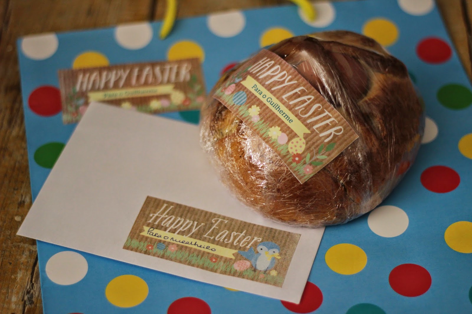 Embalei cada um dos folares com película aderente assim que ficaram completamente arrefecidos e coloquei em cada um a etiqueta com o nome do sobrinho ou afilhado. Uma etiqueta igual identificou também o saco e, no caso dos afilhados o envelope com o “folar” para o mealheiro. Os saquinhos ainda foram guarnecidos com livros e chocolates.
