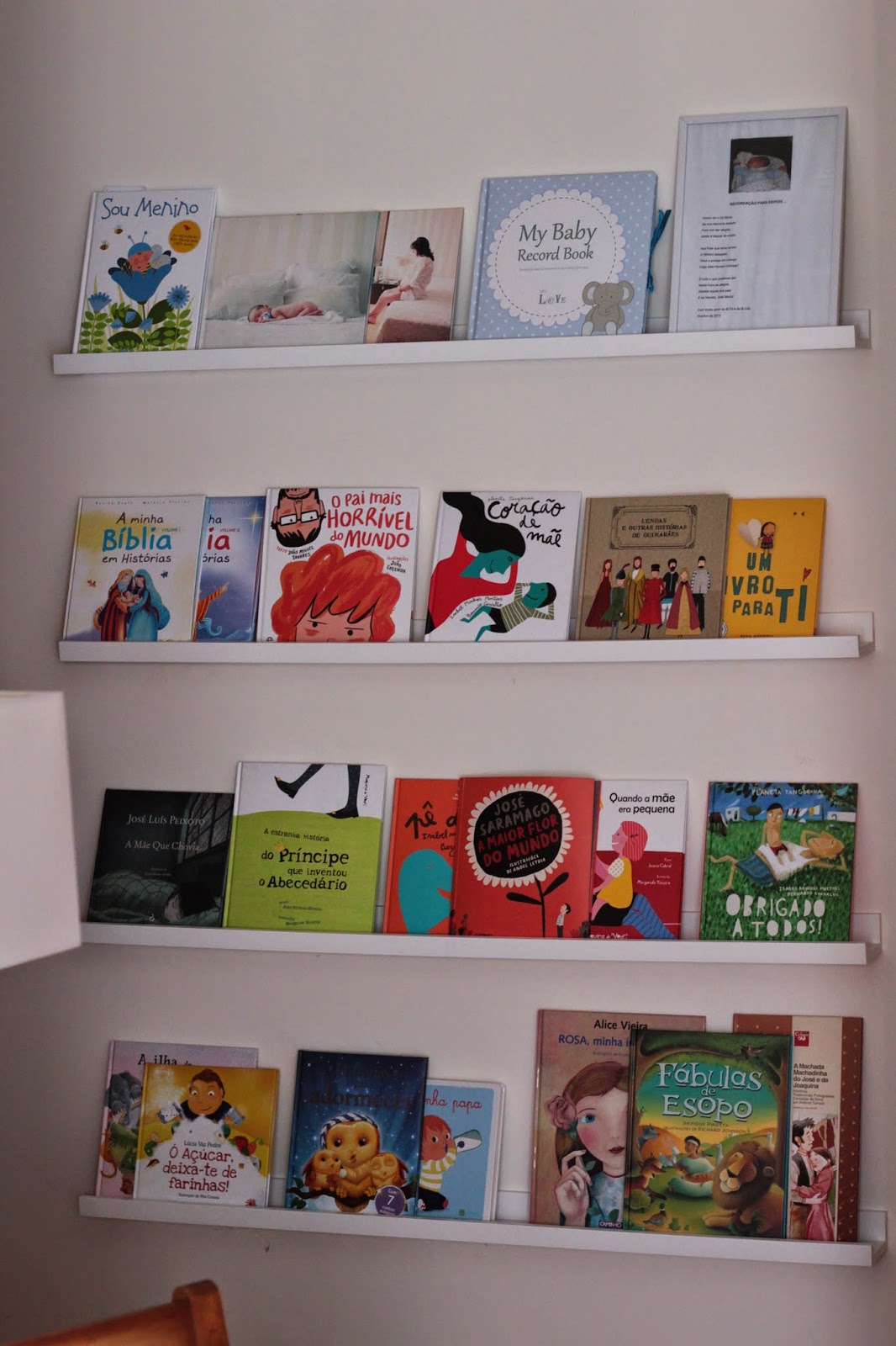 Além de ser decorativa tem também uma função de organizar os primeiros livros dele. São 4 pequenas “estantes” IKEA, que na verdade não são estantes, mas sim prateleiras para quadros (http://www.ikea.com/pt/pt/catalog/products/50152595/) , mas são perfeitas para os livros infantis que lhes vamos comprando ou que lhe vão oferecendo. A prateleira não tem muita profundidade, mas mesmo assim ainda leva dois ou três livros sobrepostos.
